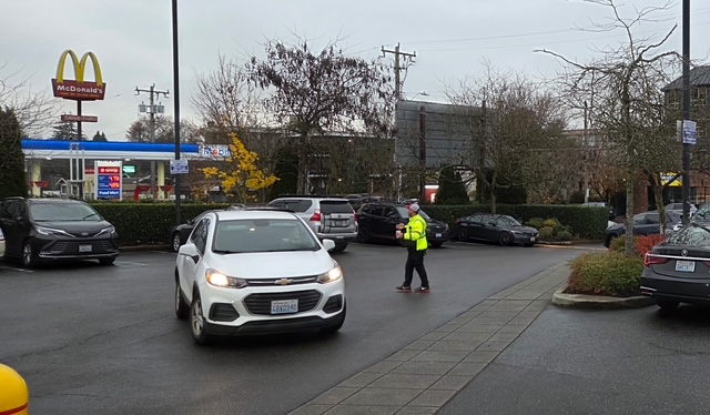 (WSB photo by Hayden Yu Andersen: Traffic-directing in WS Thriftway lot today)