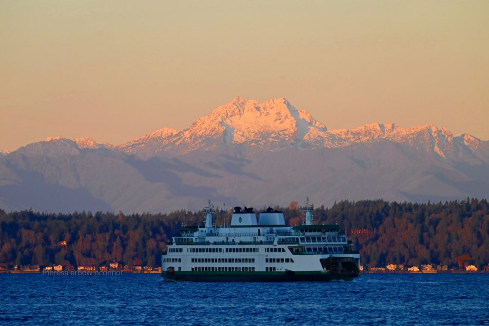 (Friday view of snowcapped Olympics and ferry – photo by Theresa Arbow-O’Connor)