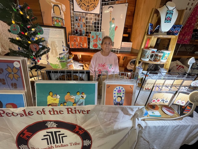 The Duwamish Tribe Longhouse and Cultural Center (4705 West Marginal Way SW) is midway through its annual three-day Native Art Market. We visited toward the end of day 1 to see some of the creations that artists and crafters are selling both in the main hall and in the year-round exhibit space. Some are from Northwest tribes, like Denise of the Skokomish: