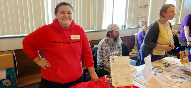 12:30 PM: If you’re bringing warm clothes to donate, do that right at the lower entrance – we photographed the cart a few minutes ago as it was filled up, again! There’s also a bin for food donations here, and the White Center Food Bank is tabling next to us, too. Sharing our table is a rep from the West Seattle Tool Library. And back downstairs is where you’ll find performances – we caught a bit of the clogging demonstration, video to come!
