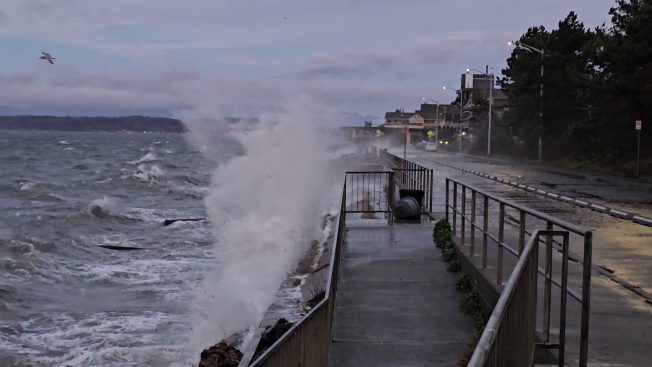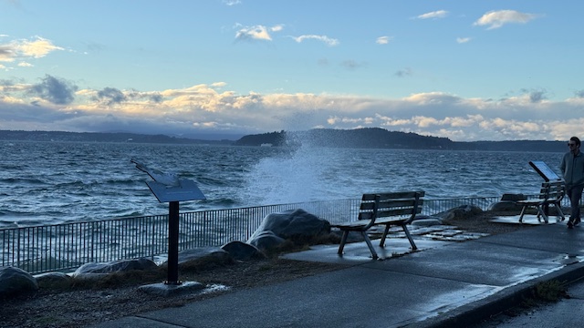 Matt and Meagan were at Constellation Park as the “king tide” arrived around sunbreak, with gusty wind still lingering from last night’s windstorm. That led to some wave action:
