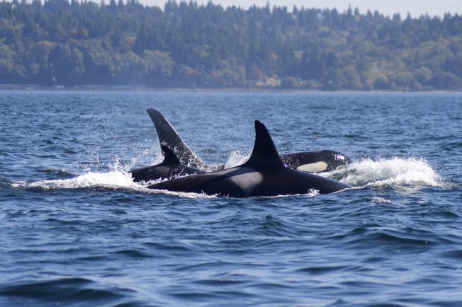 (J pod in Puget Sound. Front to back: J40 [Suttles], her daughter J63 [as yet unnamed], her brother J45 [Se-Yiā-Chn’. J63 is the newest calf in the southern resident population, currently 74 individuals [Maya Sears, Permit 27052])