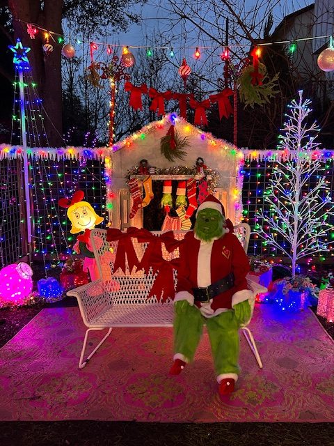 GRINCH SELFIES AT WHOVILLE: Lacey‘s setting up a life-size Grinch at her Whoville display for photo ops:
