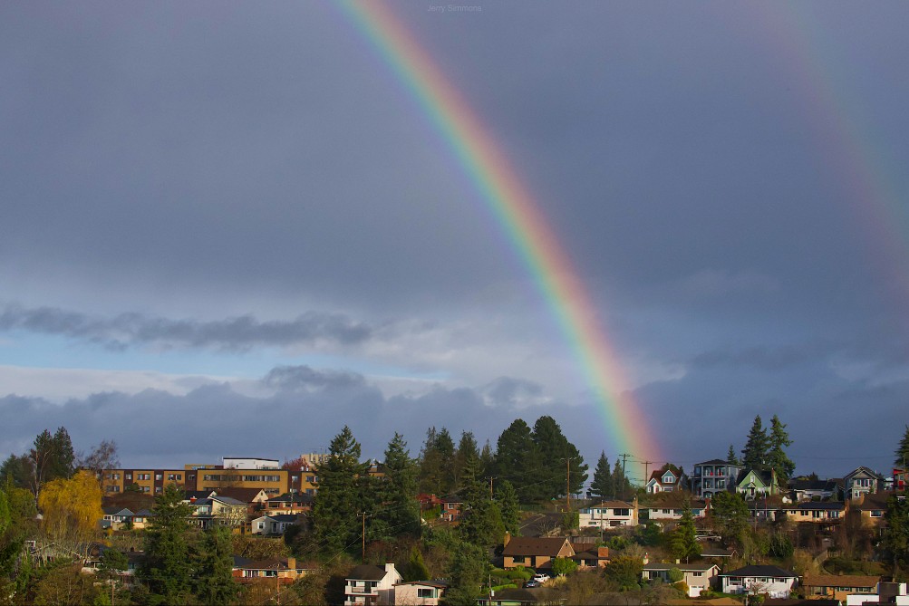 The rain returned for a while today but broke off for afternoon sunbreaks, which is when Jerry Simmons photographed this rainbow: