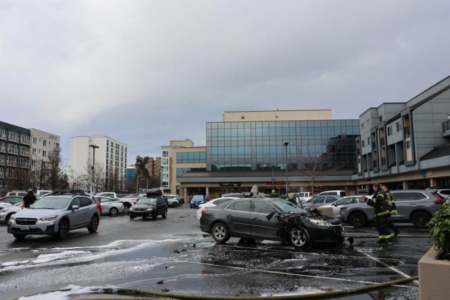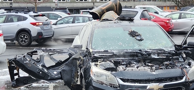 12:44 PM: Thanks for the tips and video. This past hour, firefighters were called to the center of the main Jefferson Square lot to put out that car fire. Here’s our photo of the aftermath: