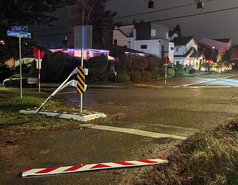 Around 9:45 pm, a loud crashing sound rang through the California/Thistle vicinity on the Upper Fauntleroy/Gatewood line. Our photo shows the aftermath. A driver went through what was a fairly elaborate DO NOT ENTER barricade, over the raised concrete island, into the stub of California SW south of it, then turned around quickly and went back to the intersection. Too dark for us to see but someone called it in to SPD as a red Honda SUV that subsequently headed eastbound on Thistle. No injuries that we know of
