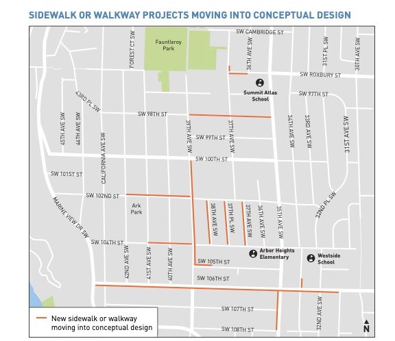 Three months after SDOT‘s Arbor Heights walking tour to talk about possibilities for new sidewalks/pathways (WSB coverage here), the department is out with its report on what it heard and what it plans to do. The report (see it here) includes this map showing blocks “moving into conceptual design” for potential new sidewalks/walkways: