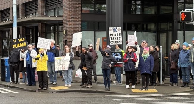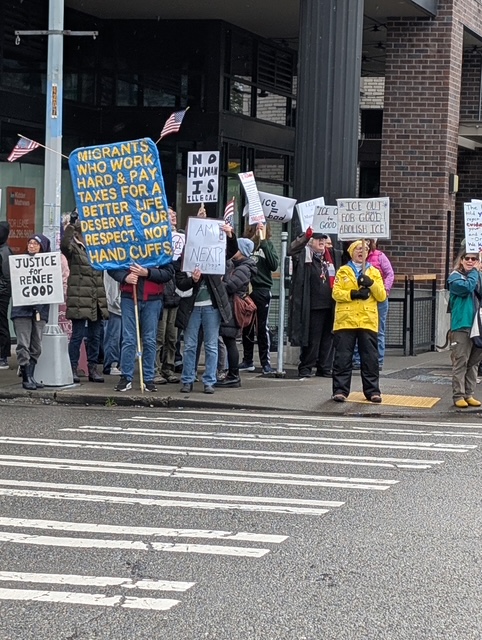 As noted in our calendar/event list, the regular Sunday protest by West Seattle Resist at California/Alaska expanded today to incorporate the “ICE Out for Good” of protests nationwide sparked by the shooting death of Renée Good by an ICE agent in Minneapolis. The traffic-cam screen grab above is from 11 am; watching the live feed, we saw demonstrators standing at corners and along the Farmers’ Market street-closure barricades until the intersection opened periodically for pedestrians, at which time some marched back and forth. About an hour and a half later, we had a photographer there for a bit: