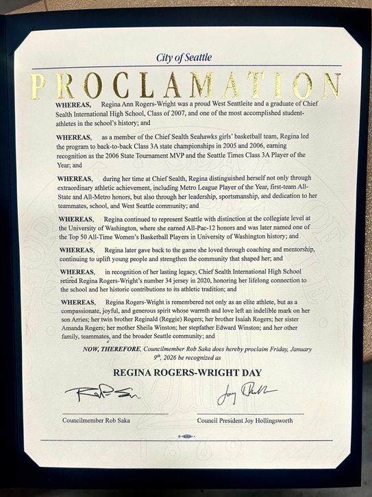 A local basketball legend and her family were honored Friday night at Chief Sealth International High School, as January 9 was officially declared “Regina Rogers-Wright Day” in the city of Seattle.