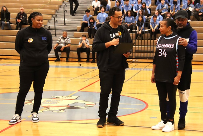 Rogers-Wright’s twin brother Reggie Rogers Jr. is a Sealth ’07 alumni and is head coach of the Mt. Tahoma girls’ basketball team. He shared emotional memories of his sister and her lasting impact on and off the court, praising her for “above all, being a mother to Arries,” her young son. Rogers thanked the Sealth community for their steady support and for hosting the game and ceremony and “welcoming us back.”