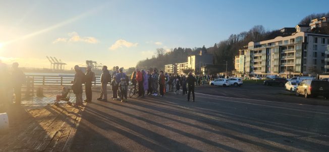 8 AM: Things are starting to pick up at Seacrest, where Sally Fox has just returned. … Moments later, Spirit of Kingston (the smaller “spare” boat) returned. Meantime, our first report from buses – one rider says her bus is already full and skipping stops.