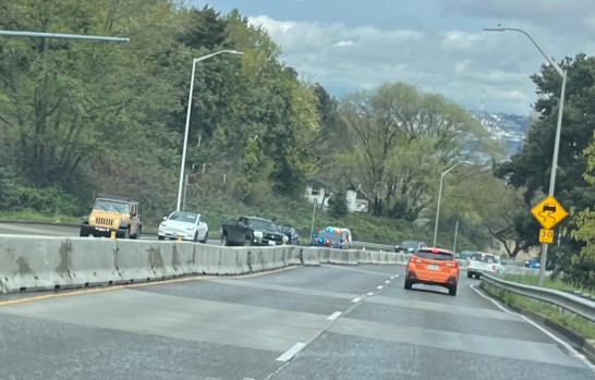 12:38 PM: The displaced barriers are affecting the eastbound side too, according to radio communication, so SDOT will be on that side as well until fixed. Meantime, a commenter below confirms the location. (And the radio check of the vehicle’s license also confirms what the commenter’s photo partly shows, that it’s a pickup truck.)