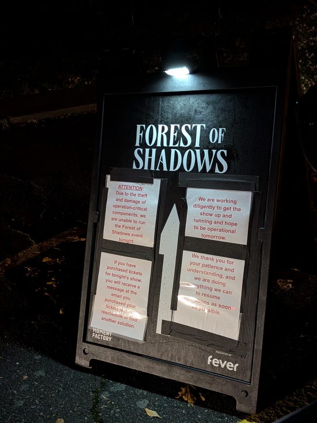 Thanks for the tips. The “Forest of Shadows“ light show at the Seattle Chinese Garden has been shut down for at least two nights because of vandalism and theft. We got a tip this morning from someone turned away last night, but the production company didn’t reply to our inquiry, there was nothing on the police map, and the online ticketing system appeared to be selling tickets for tonight (took us all the way to asking for payment info), so we hit a bit of a dead end. Then came this photo, sent a short time ago by a reader reporting they were turned away tonight. In addition, a South Seattle College spokesperson (the garden is at the campus’s north end) says show producers notified SSC security they’d been hit by vandalism and theft, no details. The show is geared for the Halloween season and was intended to run a few more days before the same area switches over to the “Astra Lumina“ holiday-season light show next week.