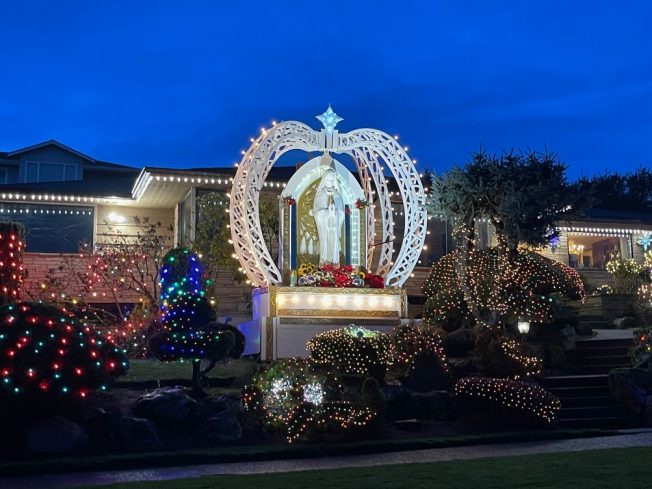 On this Christmas night, we visited 36th Avenue SW just south of SW Hanford, to see if the Gai Family‘s Madonna is in place and brightly illuminated again this season, and indeed, that’s what we found. It’s been two years since Ron Gai, son of the display’s creator Phil Gai, crafted this crown-shaped setting, and seven years since he brought back the display, which his baking-entrepreneur father had retired in 1996.