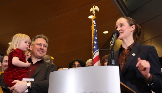 Crawley began the night’s program by voicing hope for the future, and concern about managing the political realities of the present. “People with progressive values are winning, but we cannot act like we are done. MAGA is not disappearing anytime soon, these battles won’t get easier, and we won’t be less tired next November. But we can be sure we have strong allies in the Legislature who will fight like our lives depend on it, because they do.” he said.