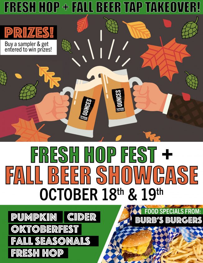 Fall is in the air! Fall is on the taps! 🍻 For two days only, we’ll have a full tap takeover of nothing but Fresh Hops, Pumpkin, Oktoberfest, Cider & Fall Favorites! Come sample the season! All Ages & dogs welcome! Grab food from Burb’s Burgers!