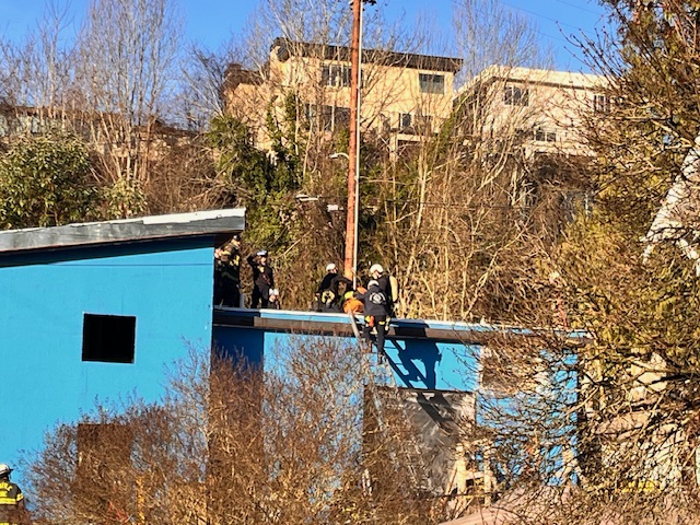 9:32 AM: Firefighters just told dispatch that “the patient is off the roof.” … Reader photo added above, sent by SeanO. The rescued person’s injuries are not described as life-threatening.