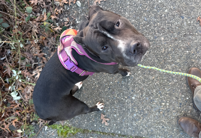 Found Very sweet Pitbull, dark Gray, no tags, nice harness, Very sociable, 80 lbs? – found this pit bull run around very very sweet on Genesee Ave & 35th, right behind the other Pecos Pit area.